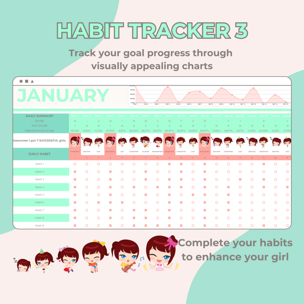 Take control of your goals and build habits that stick with Habit Tracker 3 ✿ Green! This beautifully designed Google Sheets template combines functionality and cuteness to help you track your daily progress. Featuring visually appealing charts and adorable girl-themed rewards, this tracker keeps you motivated and organized while making habit-building fun and engaging.